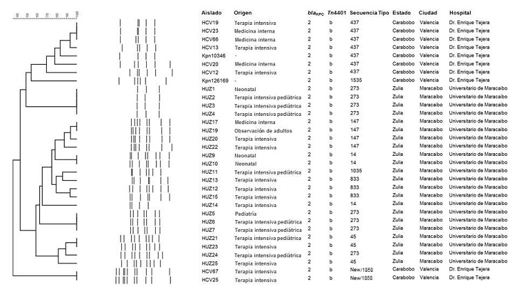 Un total de 21 de los 32 (70%) aislados de K. pneumoniae carbapenemes resistentes provienen de terapia intensiva de adultos y niños, mientras que el 30% restante fueron aislados de las áreas de medicina interna, servicio neonatal, observación de adultos y pediatría, lo cual significa que estas bacterias se encuentran ampliamente distribuidas en diferentes servicios de ambos hospitales, que son considerados centros de alta complejidad debido a que están clasificados dentro del sistema de salud venezolano como tipo IV.