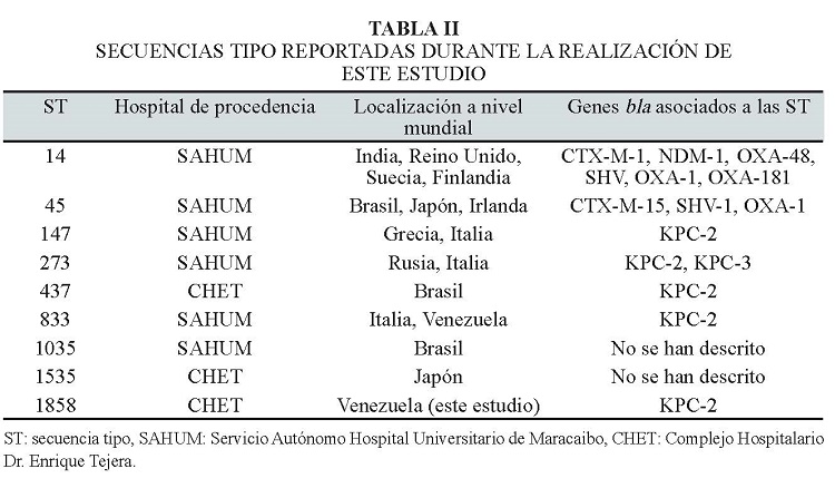 Los carbapenemes han sido el tratamiento de elección para las infecciones causadas por enterobacterias productoras de β–lactamasas de espectro extendido (BLEE), sin embargo, su uso ha traído como consecuencia la selección de bacterias resistentes (18). Aunque la resistencia a carbapenemes en enterobacterias es todavía poco común en Venezuela, es importante destacar que generalmente el gen blaKPC se localiza en elementos genéticos móviles como transposones y plásmidos que tienen capacidad de transmitirse de forma horizontal entre bacterias (5). Por este motivo, es muy importante tomar medidas de control eficaces que permitan la detección rápida de bacterias portadoras del gen blaKPC con el fin de evitar su diseminación a nivel hospitalario. En este estudio se integran los datos clínicos y moleculares de aislados de K. pneumoniae provenientes de dos hospitales públicos ubicados en los estados Carabobo y Zulia, y en el que además, se pudo determinar la presencia de los alelos blaKPC y de los genotipos circulantes.