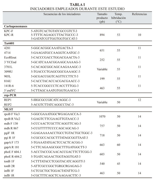 Se utilizó la reacción en cadena de la polimerasa (PCR) para detectar el gen blaKPC (10) empleando los iniciadores que se observan en la Tabla I. También se determinó el entorno genético del gen blaKPC utilizando iniciadores específicos para el transposón Tn4401 (11) (Tabla I). Después de la amplificación por PCR de los fragmentos, éstos fueron secuenciados en Macrogen, Corea, empleando los iniciadores delantero y reverso correspondientes. Se compararon las secuencian con las disponibles en la base de datos Lahey (www.lahey.org/Studies/) y el GenBank® utilizando el Basic Local Alignment Search Tool (BLAST) (www.ncbi.nlm.gov/blast/).