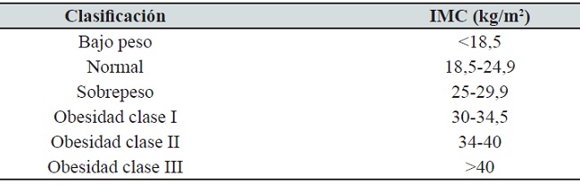 Para el diagnóstico de la obesidad, la OMS propone el cálculo del índice de masa corporal (IMC) (Tabla I); sin embargo, el IMC no refleja la adiposidad general y no permite obtener la contribución relativa de la masa grasa y la masa músculo-esquelética (MME) (21), por esta razón y para realizar un diagnóstico más preciso, se necesita hacer evaluación de la composición corporal, que busca a través de técnicas y equipos, detectar anormalidades fisiológicas en el cuerpo humano (22).