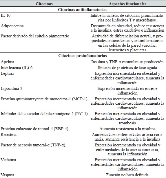 Algunas adipocitocinas y citocinas secretadas por el adipocito se encuentran en la Tabla II, varias han sido ampliamente estudiadas. En el presente artículo se revisan las que se ha considerado que tienen un importante efecto en el proceso inflamatorio y que están relacionadas con la génesis de la obesidad, con la RI y con enfermedades inflamatorias crónicas (8, 74-77).