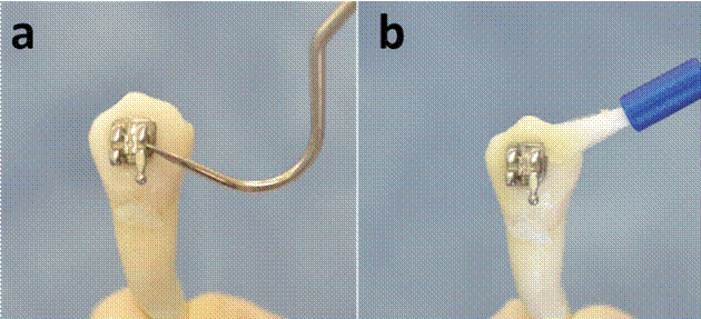 First, a prophylaxis was performed to clean the buccal surface with non-fluoride oil-free pumice paste (Prophy Tech by Zeico, Jalisco, Mexico) using a nylon brush attached to a low-speed hand piece for 10 s. The surface was rinsed with water and dried with an oil-free air spray; brackets (3G SCAPE by Ah-Kim-Pech, D.F., Mexico) were bonded to the teeth with the direct technique using TransbondTM XT light cure adhesive system (3M Unitek, CA, USA). Etching with 37% phosphoric acid gel for 20 s over the entire buccal surface was done. A layer or TransbondTM XT primer was applied to the tooth and bracket mesh and the bracket was bonded according to the manufacturers’ instructions. Careful removal of excess material was performed and light curing was applied for 60 s (15 s from cervical, incisal, mesial and distal directions). Only in Group A specimens, a thin layer (0.5 mm or less) of Clinpro™ XT varnish was applied (previously mixed the liquid and the paste on the mixing pad).varnish was placed whit a micro-brush on the entire buccal surface around the metallic bracket and light cured for 20 s according to the manufacturer (Fig.1). After this process, the teeth were stored for 24 hours in artificial saliva (Salivart by Fineman, Cleveland OH, USA) at 37 °C. Later, all specimens were submitted to a thermal cycling process, which consisted in submerging the dental organs in thermal baths filled with distilled water at three different temperatures for five hundred cycles. The temperatures were 55°C, 5°C and 37°C, the duration of each bath was 30 seconds plus 10 seconds for transporting. Then, all of the samples were submerged in a demineralizing solution (20% lactic acid solution in a deionized water, pH= 2.74) for 72 uninterrupted hours in the same solution. They were drawn out of the solution and they were rinsed with distilled water. Every sample was coated with two layers of nail polish (ORLY™, California., USA) on all tooth surfaces, except on the buccal surface where the bracket was placed. After that, the brackets were removed from both groups by using a bracket removing plier and the apical part of the root was sealed with wax to prevent the colorant to penetrate through the apex. The samples were then submerged into amber colored glass containers with 10% methylene blue (MerckTM, Damstadt, Germany) for 24 hours and they were rinsed with distilled water, letting them dry for 12 hours. A longitudinal cut was performed in every sample using a cutter (Isomet Low Speed Saw™ by Buehler, Illinois, USA) with a diamond disc. The samples were rinsed in distilled water to eliminate residues, allowing them to dry for 12 hours in order to be observed under a stereoscopic microscope (Leica EZ4HD, Singapore, Singapore). The obtained images were analyzed with the software LAS EZ 3.0.0 (Switzerland); the standard zoom for every picture was 8.5x.
