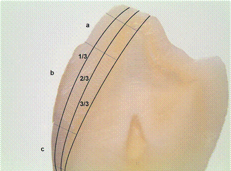 Every sample was measured three times for each of three different observers at an interval of two weeks. The observer was previously calibrated with 10 samples and a kappa concordance index was established (95%). The measurements were made based on the images obtained from the stereoscopic microscope, restricting the measurements to three zones regarding the bracket’s placement on the tooth: a) 2 mm of the occlusal third, b) on the medial third (where the bracket was placed) and c) 2 mm of the cervical third. The scale used to measure the depth of penetration (demineralization) is explained as follows: 0. - Represents no penetration of methylene blue. 1. - Represents a penetration of methylene blue of 1/3 of the enamel’s width (from the enamel surface to the dentin). 2. - Represents a penetration of methylene blue of 2/3 of the enamel’s width (from the enamel surface to the dentin).3. - Represents a penetration of methylene blue of 3/3 of the enamel’s width (the entire thickness of the enamel) (Fig. 2). The data was submitted to the data collection form, it was then analyzed using the software Minitab version 17(Pennsylvania, USA).