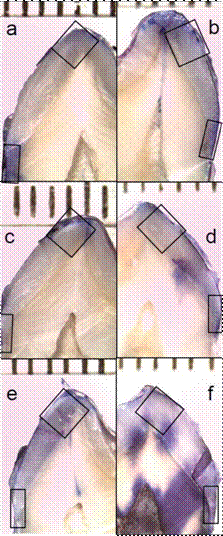 A higher penetration of methylene blue (therefore, a greater demineralization) was observed in the dental organs untreated with the ClinproTM XT varnish compared to the group where it was applied (Fig. 3). By comparing the thirds in every zone of the buccal surface, a greater percentage of demineralization was found in the cervical third of the crown. A Student’s t test was performed to find the mean and standard deviation of the measurements performed in the occlusal third, the middle third and the cervical third in each tooth. A higher significance was observed in the cervical third p≤0.0001 compared to the middle third p≤0.05 and the occlusal third p≤0.03(Table III, Fig. 4 and 5).