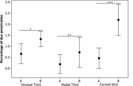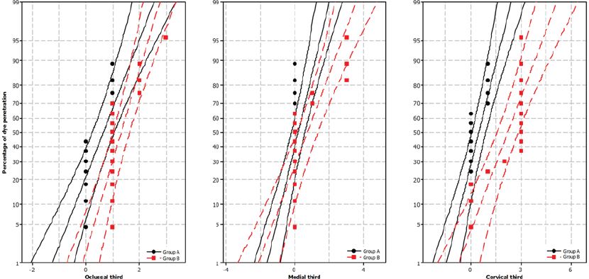 Percentage of methylene blue dye penetration into the enamel by thirds in Group A (A) and Group B (B).