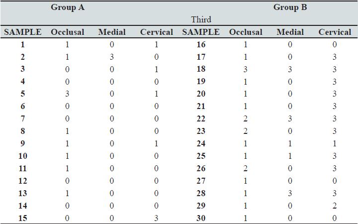 By analyzing all the samples (30 premolars) under the stereoscopic microscope, the penetration of methylene blue was obtained (demineralization) for every third of the buccal surface of the studied teeth. The score of penetration of every sample can be observed in Table I.