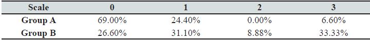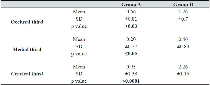 A score of penetration of 0 and 1 prevailed among the 15 premolars from Group A (penetrations 2 and 3 were less frequent), which means they presented a tooth enamel demineralization of 1/3 maximum (from the enamel surface to the dentin). By comparing Groups A and B, it can be seen that the group that had the greater protection against the demineralization was group A, with 69%; unlike group B who presented a protection of 26.6% (Table II).