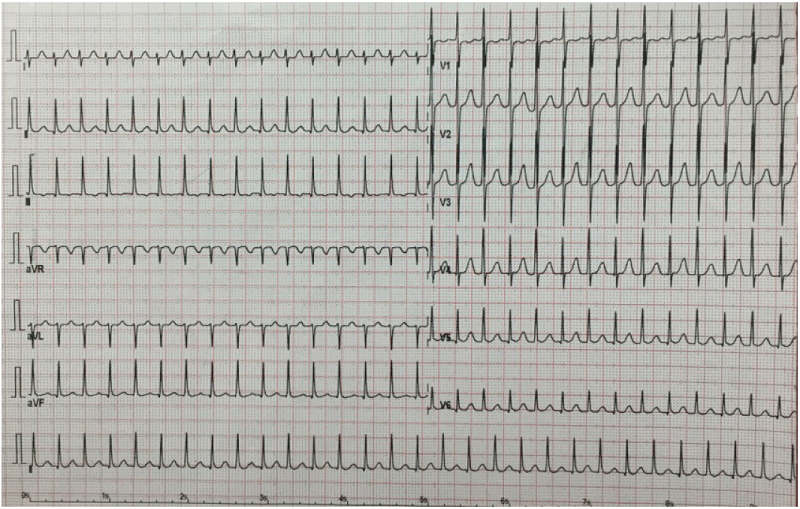 We report the case of a 29yearold man who presented with a history of weight loss for six months. Over this period of 6 months, he lost 15 kg. He has a positive history of diabetes mellitus in both parents. He did not seek for medical attention. Five days before his admission to our hospital, he presented with diaphoresis, dyspnea, thirst and palpitations. When his symptoms worsened he decided to go seek for medical attention. The attending physician found him drowsy, de hydrated, with acidotic breathing. His vital signs (VS) were: BP: 90/60, respiratory rate 32 cycles/minute, pulse rate 216/minute, and temperature 36.5°C. His random blood glucose was 458 mg/dL, with ketonuria. The treatment started with crystalloids with a double way (Hartmann and 0.9% saline solution, 1 liter of each solution), sodium bi carbonate (222.5 mEq) and insulin infusion (100 UI of insulin in 100 mL of 0.9% saline solution to 4 mL/min). The patient was sent over to the second level 3 h later with a diagnosis of severe DKA. Upon entering the Regional General Hospital # 36 (RGH) the patient was directed to the Triage Area and immediately transferred to the Reanimation Area. His vital signs at the time of entering were BP 90/60mmHg, respiratory rate 18 cycles/minute, pulse rate 213/minute, and temperature 36.7°C. Therapy continues with the hydration by double way with Hartmann solutions. The ECG was performed, detect ing SVT (Fig. 1).