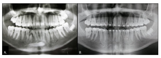 Male, 25 years of age. Both the 2.3 and 4.3 were absent, with corresponding gaps, and the 2.2 was microdontic (Fig. 7). The radiograph showed that both missing teeth were in transmigration (Fig. 8A) and the inferior one was a type 2 transmigration. The patient decided on monitoring for both teeth to allow orthodontic treatment to open the spaces and then restore the errant canines to their places. The 2.5-year follow-up panoramic x-ray showed no significant changes (Fig. 8B).