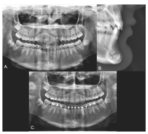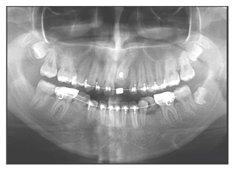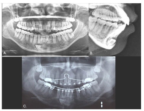 Female, 15 years old. As with Case 1, the inferior left canine was the only primary tooth remaining in the mouth (Fig. 3). The radiograph showed that the 3.3 exhibited a type 2 transmigration (Figs. 4, A and B). The tooth was located closer to the mandible edge than in Case 1, precluding the use of orthodontic traction, and it was decided to monitor the tooth. Dental protrusion was the initial reason for the appointment, and the patient requested orthodontic treatment of this condition. Because the 3.3 was far from the roots of the neighboring teeth, the orthodontist decided there would be no risk in moving teeth in this zone. To correct the protrusion, the first premolars were extracted (except for quadrant 3 since the 3.3 was transmigrated). The 3.3 would not be restored in this treatment since the 3.4 would take its place. The 1-year follow-up panoramic x-ray showed no significant changes (Fig. 4C).