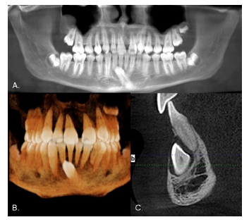 Male, 12 years old. Clinical examination revealed that the inferior left canine was the only primary tooth still present (Fig. 1). The panoramic radiograph showed that the 3.3 was in a type 1 transmigration (Fig. 2A). The cone beam computed tomography (CBCT) showed that the crown of the transmigrated canine was very close to the adjacent incisors’ roots (Figs. 2 B and C). Despite the recommendation for surgical removal or even orthodontic traction, the parents chose not to treat the transmigrated tooth and instead to follow up with periodic radiographs.