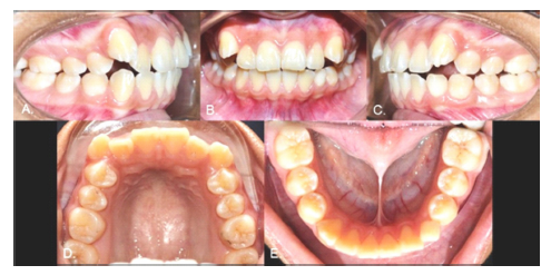Female, 16 years of age. The 1.5, 2.1, 3.5, 4.3, and 4.5 teeth were missing, and the inferior right primary canine and two primary second molars were still present (Fig. 13). The radiograph showed that the 4.3 was in type 1 transmigration, the 1.5, 3.5, and 4.5 exhibited agenesis, and the 2.1 was impacted and had an associated supernumerary tooth (Fig. 14A). The simultaneous presence of supernumeraries and agenesis is a very rare (0.33%) condition known as concomitant hypo-hyperdontia (14). As in Case 6, the 4.3 was near the roots of neighboring teeth and the CBCT revealed a lesion that extended from the right deciduous canine to the left lateral incisor, almost as if showing the path that the transmigrated canine had followed (Fig. 14, B-D), so it was extracted. The 2.1 was surgically exposed and a post attached to it to allow its movement with orthodontics. The gap for the 1.5 was to be closed using orthodontics, but the spaces for the inferior premolars were to be maintained for later rehabilitation with dental implants (Fig. 15).