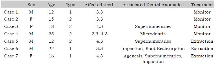 Only three of the eight canines (37.5%) were extracted; the remaining five were monitored. Of the mandibular canines, two of the three type 1 canines (66.67%) were extracted, and one of the four type 2 canines (75%) was extracted. Five of the seven patients (71.42%) exhibited associated dental anomalies, the most frequent being supernumerary teeth (n=3), followed by impaction of other teeth (n=2); one patient had three associated anomalies (Table I).