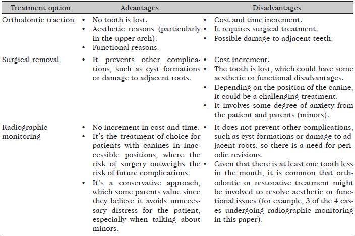 Regarding diagnosis, CBCT is recognized as the best method to evaluate impacted teeth (2). However, there is not a consensus regarding the reasons that would justify CBCT as the first-line tool to evaluate this condition (16) and even less support for using CBCT for transmigrated canines. Some authors claim that the use of CBCT is indicated when: a) conventional radiography does not provide sufficient information (17); b) it is important to have a precise location and a tridimensional position of the impacted canine (16); and c) it is necessary to evaluate the root resorption of adjacent teeth (16-18). Since all the subjects in this report were orthodontic patients, the diagnostic was done with a routine panoramic x-ray; two of them had CBCT scans, which in those cases allowed a better view of the tooth location and assessment of the health condition of adjacent structures, just as the literature review suggests.