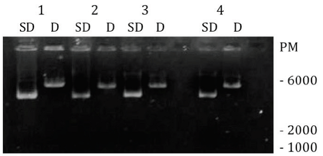 A partir de las manipulaciones de biología molecular realizadas para la construcción y clonación del ADN recombinante que contiene la secuencia que codifica la proteína scFv-Fc anti-HER2, se obtuvieron colonias de E. coli resistentes al marcador de selección. Para corroborar que la resistencia era una consecuencia de la presencia del ADN plasmídico que contenía la secuencia construída, se procedió a purificar ADN plasmídico a partir de las colonias transformantes y realizar una digestión diagnóstica con la enzima de restricción SacI. La secuencia construída introduce un sito de corte único para esta enzima en el ADN del plásmido original a 819 bases del origen de replicación y aumenta su peso molecular a aproximadamente 6000 bp. En la Fig. 1 se observa que el ADN plasmídico, purificado a partir de cuatro colonias escogidas para el diagnóstico (carriles SD, sin digerir), migró en la separación electroforética de la forma esperada (a aproximadamente 6000 bp) luego de la digestión (carriles D, digerido).