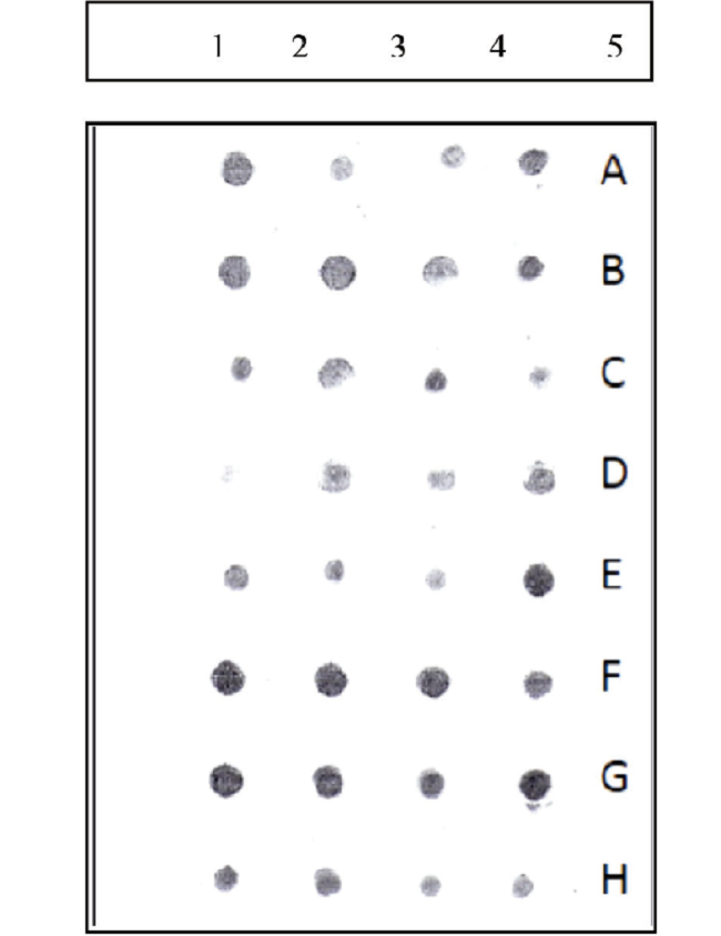 El escrutinio de los sobrenadantes de las colonias de transfectomas obtenidos se realizó mediante la técnica de “Dot blot”. En la Fig. 2 se muestra una imagen de la membrana de nitrocelulosa a la cual se adsorbieron las muestras de sobrenadante de cada uno de los cultivos. Se observa que, con excepción de las células transfectadas con el plásmido control (pMMP-mIL-12.IRES. eGFP, columna 1), en todos los transfectomas se detectó la presencia de la porción Fc de la IgG1 humana, lo cual es sugestivo de la presencia de la proteína de fusion scFv-Fc anti-HER2 en estos sobrenadantes. Aun cuando se aprecian diferencias aparentes en la intensidad de la señal entre los distintos sobrenadantes analizados, ello no puede ser tomado como una indicación de mayor o menor producción pues los cultivos no se encontraban sincronizados para la producción.