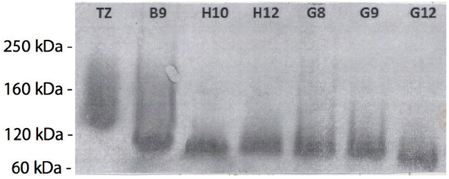 Con la finalidad de determinar el peso molecular aparente de la proteína de fusión obtenida y tener una imagen cualitativa de su concentración relativa en cada uno de los sobrenadantes de los cultivos sincronizados de los transfectomas, se utilizó la técnica de electroforesis en geles de poliacrilamida en condiciones desnaturalizantes, no reductoras (SDS-PAGE). En la Fig. 3 se muestra el resultado de la separación electroforética. Se observan varias bandas por carril, destacándose principalmente dos: una de aproximadamente 00.000 de peso molecular, la cual se encuentra por debajo de la banda correspondiente al peso de trastuzumab, y otra de aproximadamente 60.000. El peso molecular aparente del dímero de proteína de fusión, de acuerdo a la secuencia de aminoácidos esperada, es de 100.000, mientras que el monómero tendría un peso aproximado de 50.000.
