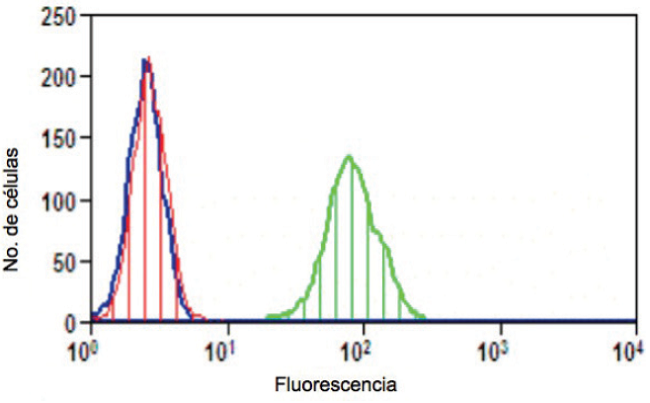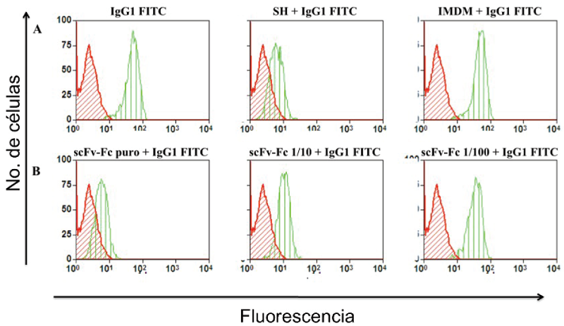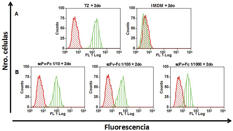 Para comprobar la unión de la proteína recombinante scFv-Fc anti-HER2 a su antígeno, se utilizaron células de cáncer de mama SKBR-3 (American Type Culture Collection, EEUU), las cuales sobre-expresan el receptor HER2. Dichas células fueron despegadas de los frascos de cultivo mediante tratamiento con 0,05% Tripsina-EDTA (Gibco, EUA) a 37ºC durante 5 minutos. Luego de un lavado con PBS, se procedió al contaje celular en cámara de Neubauer utilizando azul de tripano (0,4%). La suspensión se ajustó a una densidad de 106 células/mL en PBS-BSA 0,1% y se trató con suero de rata en hielo durante 10 minutos. Transcurrido ese tiempo, se añadieron alícuotas de 100 μL de la suspensión celular a 500 μL de sobrenadante de cultivo de un transfectoma productor de la proteína recombinante, de medio de cultivo o de una solución de Trastuzumab (500 ng/mL) en medio de cultivo. Las células así tratadas fueron incubadas en agitación a 4ºC durante 1 hora. Una vez finalizada la incubación, las células fueron lavadas con PBS-BSA 0,1%, suspendidas en 500 μL de PBS-BSA 0,1% y luego se les añadió 1 μL de una dilución 1/5 de un conjugado anti-Ig humana/isotiocianato de fluoresceína (FITC) (Wellcome Research Laboratories, Inglaterra), incubándose nuevamente a 4°C durante 1 hora. Al finalizar la incubación y luego de otro lavado con PBS-BSA 0,1%, las células se suspendieron en 0,2 mL de PBS-BSA 0,1%. Finalmente, cada una de las muestras se analizó mediante citometría de flujo (FACScalibur, Becton Dickinson, San Diego, CA, EUA) para determinar el número de células positivas a la unión de la proteína recombinante scFv-Fc anti-HER2.