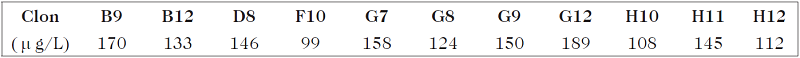 La concentración de proteína de fusión en los sobrenadantes de cultivo obtenidos de los transfectomas positivos para el dot blot se determinó mediante el cultivo sincronizado de los distintos transfectomas y el posterior análisis de los sobrenadantes mediante la técnica de ELISA tipo sándwich. Los resultados obtenidos se muestran en la Tabla I, donde puede apreciarse que los sobrenadantes examinados contienen entre 99 y 189 g/L de proteína de fusión scFv-Fc anti-HER2, destacándose los clones G12 y B9 como mejores productores bajo las condiciones estudiadas. Sin embargo, es de hacer notar que el clon G12, además de presentar una buena producción, tuvo una tasa de proliferación inferior a la del clon B9 (datos no mostrados), lo que sugiere que es más eficiente, ya que requiere de menos recursos para su cultivo.