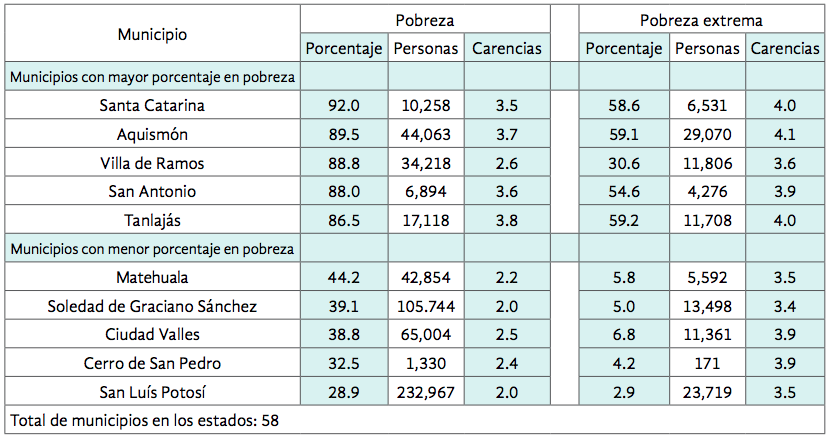 CONEVAL. (2010). Municipios con mayor y menor porcentaje en situación de pobreza. Consultado el 28 de octubre de 2015. http://i1.wp.com/noticieropotosino.mx/wp-content/uploads/2015/09/IMG_3701.png