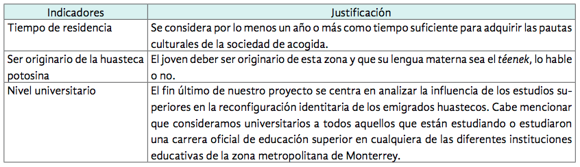 Con la información recogida de los líderes comunitarios, dimos continuación a la segunda parte del trabajo de campo, la cual fue realizada en la ciudad de Monterrey, durante el periodo de julio y agosto de 2015. Aquí se procedió a la ubicación y localización de los estudiantes indígenas de nivel universitario que procedieran de alguna comunidad de los municipios considerados a priori. Para la selección de los estudiantes indígenas que forman parte de nuestro universo de estudio se consideraron los siguientes requisitos: (tabla 2)