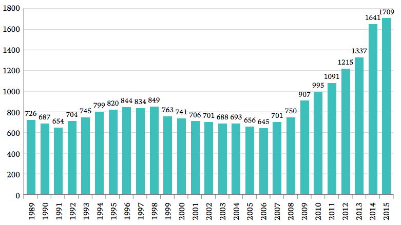 O gráfico 9 demonstra a evolução do número de estudantes estrangeiros matriculados anualmente na Unicamp, considerando o período de 1989 a 2015. (Gráfico 9).