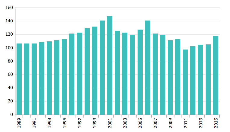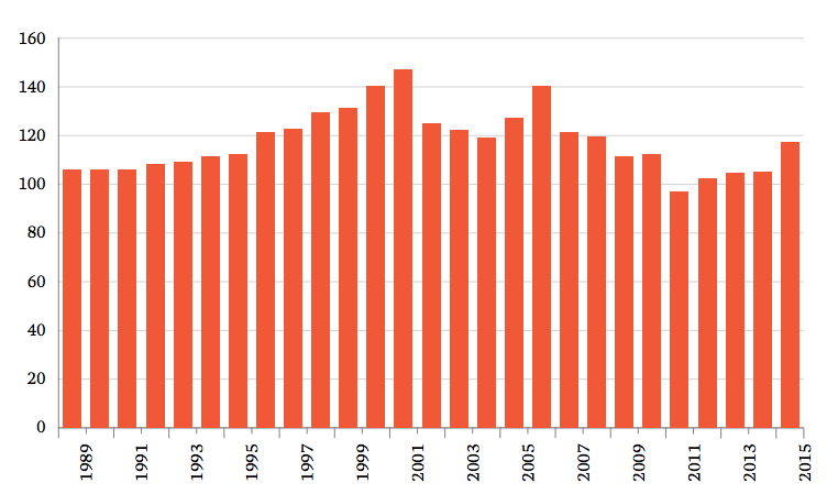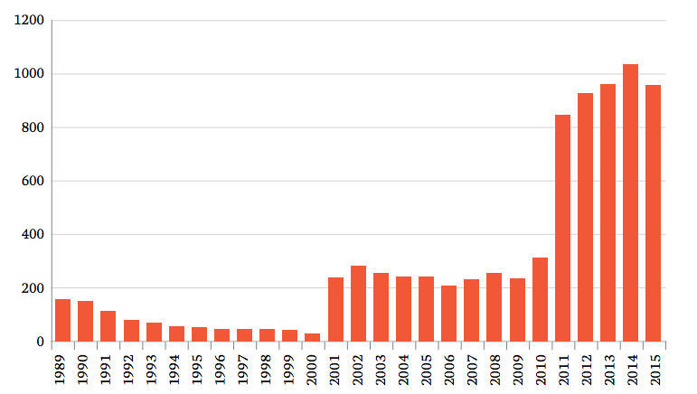 O gráfico 11 demonstra o número de estrangeiros trabalhando na universidade no período de 1989 a 2015. (Gráfico 11).