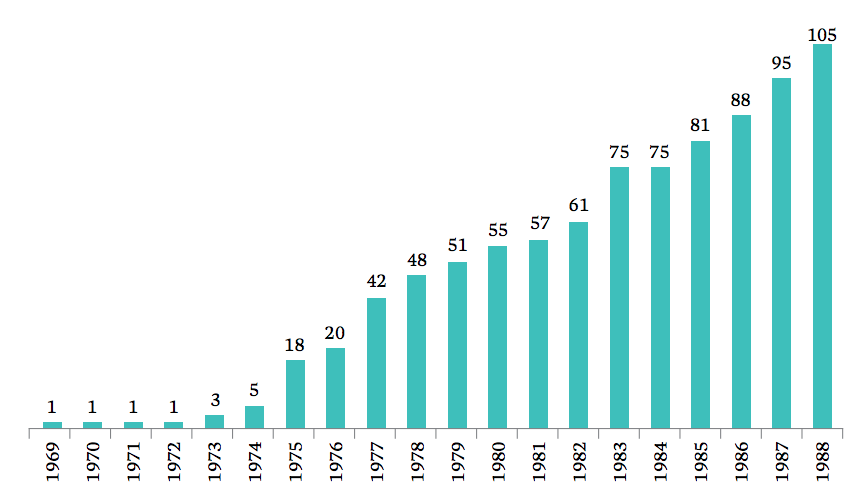 No gráfico a seguir observa-se a evolução dos estrangeiros contratados nos quadros docente e administrativo da Unicamp, no período de 1969 a 1988. (Gráfico 1).
