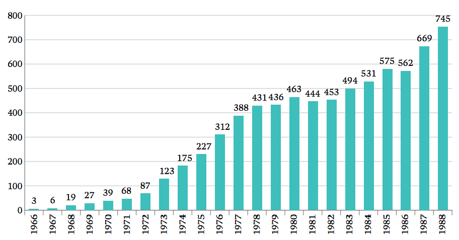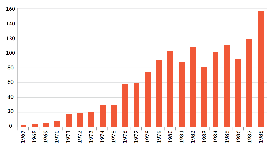 O gráfico a seguir mostra os funcionários da Unicamp em afastamento no exterior no período de 1967 a 1988. (Gráfico 2).