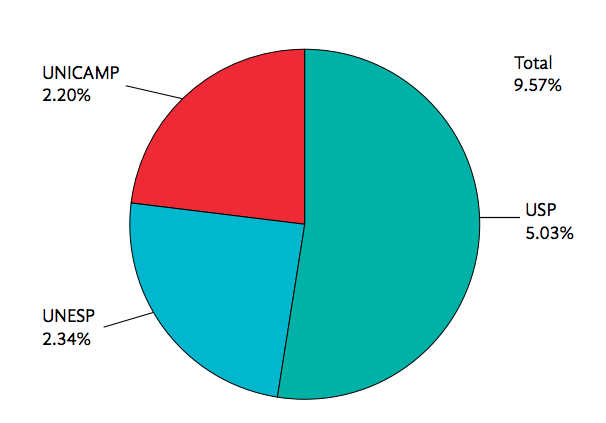 O percentual destinado para as três universidades paulistas, USP – Universidade de São Paulo, Unicamp – Universidade Estadual de Campinas e UNESP – Universidade do Estado de São Paulo e que inicialmente era 8,4%, passou para 9% em 1992 e para 9,57% em 1995. O percentual de 9,57% é distribuído para as três universidades paulistas, conforme demostrando no gráfico. (Gráfico 4).