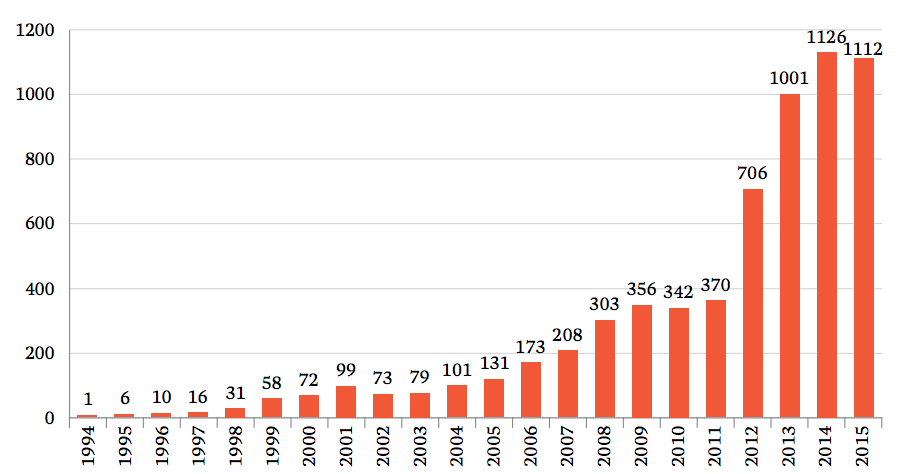 O reconhecimento internacional da Unicamp pode também ser observado no crescimento do número de Artigos publicados em revista de circulação internacional, conforme demonstrado no gráfico abaixo que mostra a evolução das publicações no período de 1993 a 2014.