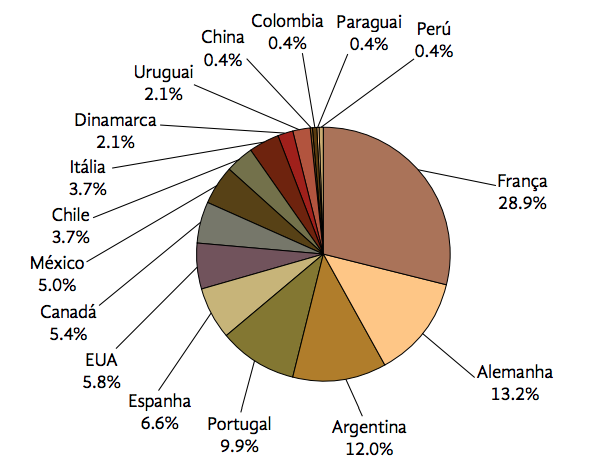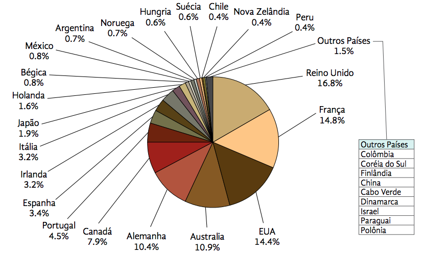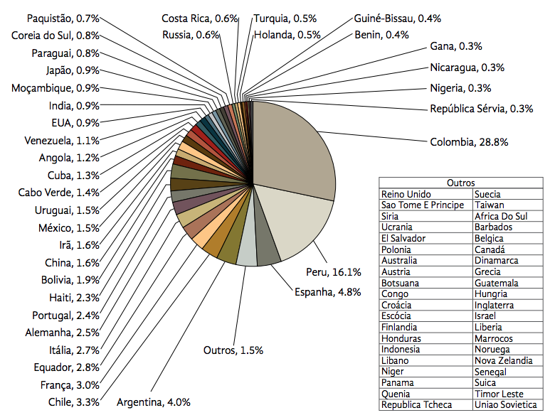 No gráfico a seguir observa-se a predominância de estudantes oriundos da Colômbia e do Peru, seguidos por Argentina, Espanha, Chile e Equador, com participação não significativa de mais de 60 países. (Gráfico 8).