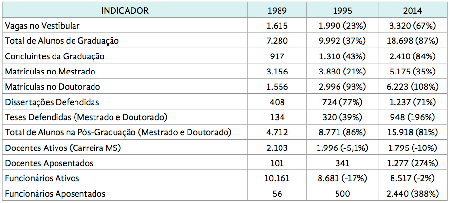 Pode-se observar que houve um aumento considerável no número de vagas oferecidas no vestibular e no total de alunos de graduação e pós-graduação bem como na produção de dissertações e teses em contrapartida com um decréscimo no número de funcionários docentes e técnico-administrativos na ativa.
