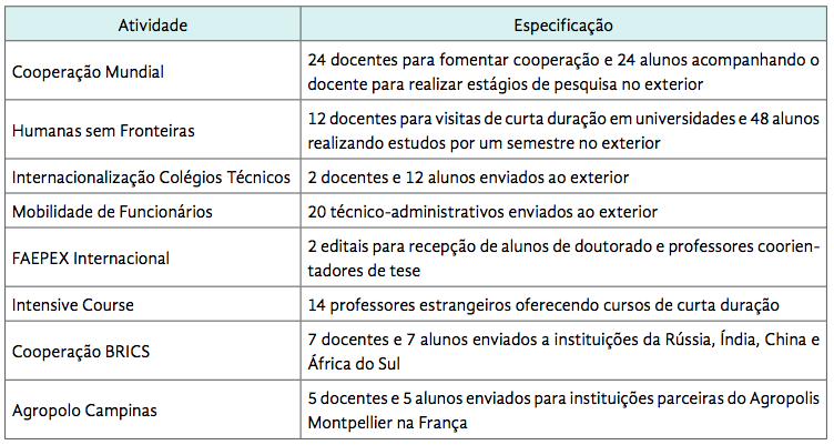 Além dos editais específicos do Programa de Internacionalização a Unicamp oferece outras oportunidades para mobilidade no exterior a professores, técnico-administrativos e alunos, conforme demonstrado a seguir. (Tabela 3).