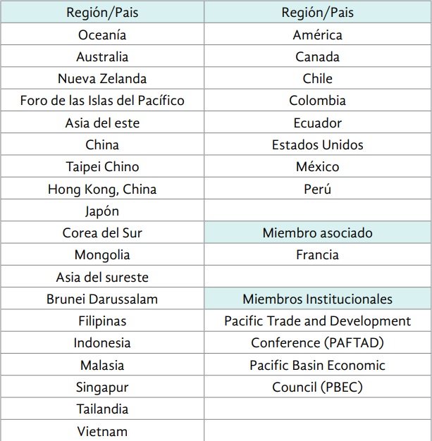El foro Pacific Economic Cooperation Council fue creado en septiembre de 1980, en Canberra, por iniciativa de Masayoshi Ohira y de Malcolm Fraser, entonces primeros ministros de Japón y de Australia. El objetivo de PECC es estudiar los temas relevantes del desarrollo regional y formular recomendaciones destinadas a los actores sociales involucrados en esos temas. El criterio fundamental para participar en el foro es que un país determinado esté situado físicamente en la región del Pacífico, considerada ésta en un sentido muy amplio; sobre esta base, PECC cuenta con 23 comités nacionales y con Francia como miembro asociado, pues algunos de sus territorios de ultramar están situados en el Pacífico; adicionalmente, la Pacific Trade and Development Conference (PAFTAD) y el Pacific Basin Economic Council (PBEC agrupa representantes del sector privado) participan como miembros institucionales (ver cuadro 1). El rasgo distintivo de los comités nacionales de PECC consiste en que están constituidos por representantes gubernamentales, de la industria y del sector intelectual; pero la participación es estrictamente personal, para garantizar la libertad de las discusiones y la neutralidad de las opiniones formuladas.
