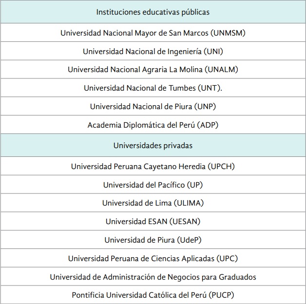 En noviembre de 1998, Perú fue reconocido como miembro de pleno derecho de APEC. Con ello, culminó una ofensiva diplomática que permitió la incorporación del sector privado peruano al Pacific Basin Economic Council (PBEC), en 1990, y el reconocimiento del comité nacional por parte de PECC, en 1991. La participación de personalidades académicas en este último, llegado el momento, facilitó la creación de Centros de Estudios APEC por parte de universidades tanto públicas como privadas. En 2008, las instituciones involucradas en los estudios sobre Asia y sobre la región del Pacífico decidieron crear la Red Peruana para Estudios del Asia Pacífico (REDAP). La REDAP funciona bajo el principio de una coordinación anualmente rotativa y de acuerdo con la antigüedad del reconocimiento de cada institución como Centro de Estudios APEC.[34] En la actualidad, REDAP está constituida por 14 instituciones educativas, de las cuales seis son públicas y ocho privadas (ver cuadro 2).