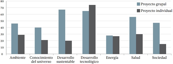 A partir de la información disponible, que corresponde a los resultados reportados a diciembre de 2014 (566 cátedras), se identifican algunos elementos de la gestión del programa en el breve periodo de su implementación. En relación con los campos temáticos es posible advertir un equilibrio en la asignación de cátedras entre los diferentes campos, con excepción del desarrollo tecnológico que registra un mayor número de cátedras asignadas (ver gráfica 1). En la mayor parte de los campos temáticos se dio prioridad a los proyectos grupales. Las excepciones fueron los campos de Energía, donde los proyectos grupales e individuales representaron cifras similares en cuanto al número de cátedras asignadas, y el campo de Desarrollo tecnológico, donde los proyectos individuales tuvieron un mayor peso (ver gráfica 2).