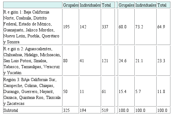 La respuesta de las instituciones a las convocatorias del programa de Cátedras Conacyt es reveladora de las capacidades construidas en cada establecimiento y en los nichos disciplinarios. Las instituciones, y particularmente los estados, fueron clasificados en tres regiones, esto se hizo en función del número de investigadores que tuvieran en el SNI, de los posgrados inscritos en el PNPC y de la infraestructura disponible. En la región 1 se ubicaron los estados con mayor desarrollo; en la región 2 los de mediano desarrollo y en la región 3 los de menor desarrollo.