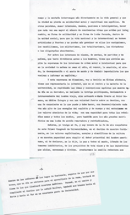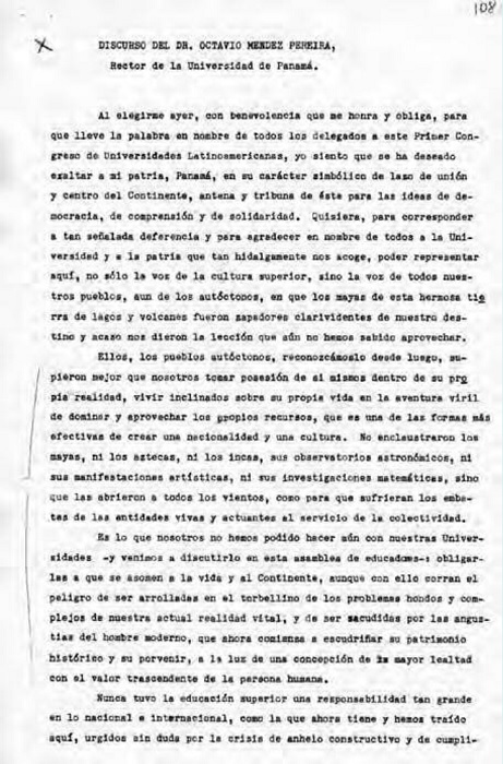 La dificultad es, en muchos casos, cómo ocurre esa internacionalización entre las jerarquías de las múltiples variedades de la educación superior de las distintas universidades en esta parte del continente, ya sea con las mismas de América Latina, América del Norte, Europa y el resto del mundo. El Dr. Octavio Méndez Pereira, Rector de la Universidad de Panamá, manifiesta en su discurso para el Primer Congreso de UDUAL esta preocupación actual que, como es evidente, lo fue desde siempre. Con ánimo de reseñar la acción ejemplar de las poblaciones originarias de nuestra América, además de enfatizar el lugar que ocupa Panamá geopolíticamente, asegura que “en su carácter simbólico de lazo de unión y centro del Continente”, el rector panameño destaca que “No enclaustraron los mayas, ni los aztecas, ni los incas, sus observatorios astronómicos, ni sus manifestaciones artísticas, ni sus investigaciones matemáticas, sino que las abrieron a todos los vientos, como para que sufrieran los embates de las entidades vivas y actuantes al servicio de la colectividad. Es lo que nosotros no hemos podido hacer aún con nuestras Universidades –y venimos a discutirlo en esta asamblea de educadores-“(p.1).