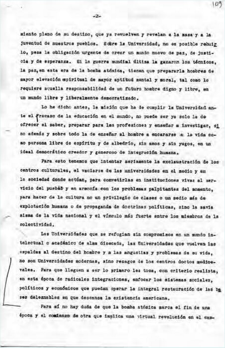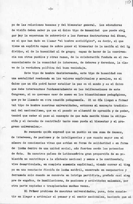 “Nunca tuvo la educación superior una responsabilidad tan grande en lo nacional e internacional, como la que ahora tiene y hemos traído aquí” (p.1 y 2). Finalmente, la idea es que el cuerpo académico reflexione acerca de los obstáculos tanto sociales como políticos que no dejan fluir los probables intercambios entre nuestras instituciones, dedicadas a la educación superior, justamente mientras revisamos de manera retrospectiva este tipo de problemas actuales. Más adelante en su texto, el Rector de la Universidad de Panamá afirma: “El Primer Problema de nuestras universidades, pues, debe consistir en llegar a articular el pensar y el sentir nacionales […] sumar intereses, deseos pasiones e inteligencias, hacer que cada vez sea mayor el número de conciencias vivas que actúen por intercambio, en forma de solidaridad y en forma de lucha fecunda, dentro de la unidad social, para que la vida nacional e internacional se tornen articuladas y fuertes y no puedan más germinar en ellas los caciquismos, los caudillismos, los militarismos, los totalitarismos, las dictaduras o las oligarquías absorbentes” (p.4).