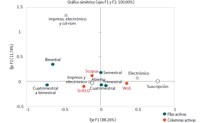 Con el fin de analizar los patrones de participación en los índices de acuerdo con algunas de las características de las propias revistas (país de edición, idiomas que aceptan para su publicación, cobertura temática, formato, tipo de acceso y periodicidad) se obtuvo información de las páginas web de las 94 revistas que fueron identificadas en las tres bases de datos, tarea que se realizó entre los meses de septiembre de 2016 y febrero de 2017. El análisis de esta información se realizó a través de frecuencias en tablas de contingencia. Con la finalidad de brindar una apreciación más clara sobre la asociación que se establece entre las características de las revistas y su participación en alguna de las tres bases de datos, se decidió utilizar también el análisis factorial de correspondencias, debido a que esta prueba no paramétrica sirve para analizar tablas de contingencia y brinda gráficos que permiten identificar con mayor claridad las asociaciones que se establecen entre las características de las revistas y su participación en cada uno de los sistemas de indización.