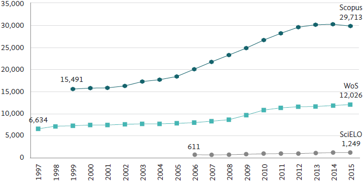 Un primer aspecto que llama la atención al apreciar la participación de las revistas de investigación educativa de los países de Iberoamérica es la baja representación que tienen en las tres bases de datos. En 2015, las revistas de educación representaban en el WoS el 1.92% del total de revistas indizadas en dicha base de datos; en Scopus el 3.59% y en SciELO el 4.56%. De ellas, las que correspondían a los países iberoamericanos representaban en el WoS sólo el 0.07% (9 revistas) con respecto al total de revistas, en Scopus el 0.20% (58 revistas) y en SciELO, que es una base regional, el 4.56% (57 revistas).