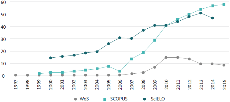 Entre el año 2006 y 2015, la participación de revistas que abordan desde distintas perspectivas el tema pasó de 1 a 9 en el caso del WoS, de 4 a 58 en el caso de Scopus y de 31 a 57 en el caso de SciELO. Si bien, en el WoS hay una tendencia errática pues crece en los años 2010 y 2011, después tiende a disminuir. En Scopus, las revistas de educación presentan un rápido crecimiento entre 2006 y 2010, pero a partir de ese año disminuye su tasa de crecimiento. En SciELO se presenta un crecimiento más regular pero también decrece ligeramente hacia el año 2014.