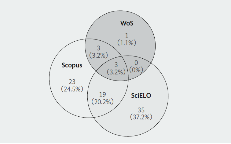 Otro aspecto a destacar es que la participación de las revistas iberoamericanas es diferente en cada una de las bases de datos. De las 94 revistas identificadas en las tres bases de datos, sólo hay tres revistas que llegaron a participar simultáneamente en las tres bases de datos; si bien, en 2015 dos de ellas ya no participaban en el WoS. Por su parte, Scopus es la base de datos que comparte el mayor número de revistas con las otras dos bases de datos: 13 revistas con el WoS y 19 revistas con SciELO. A su vez, SciELO es la base de datos que contiene el mayor número de revistas iberoamericanas que no han participado en las otras bases de datos durante el periodo de análisis, con un total de 35; le sigue Scopus con 23 revistas y finalmente el WoS, sólo tiene una revista que no participa en las otras bases de datos.