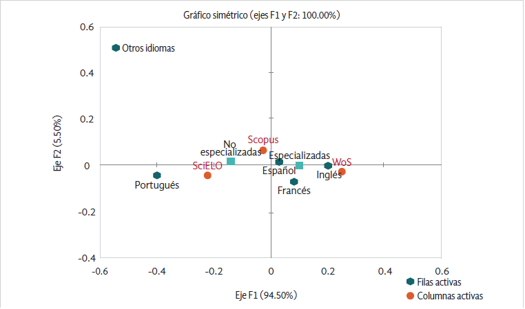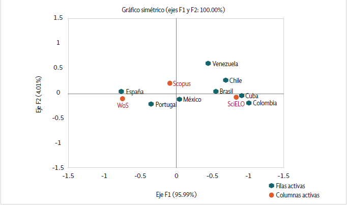 Al analizar el país de edición de las revistas, se percibe con claridad que solamente España y Portugal son los países que se asocian con la participación en el WoS. Asimismo, se aprecia que la mayor parte de los países de Latinoamérica son los que se asocian particularmente con su participación en la base regional SciELO, donde llama la atención el caso de Colombia que tiene una alta participación en esta base, pero no en Scopus y WoS. Por su parte, Brasil y México, quedan en posiciones intermedias entre Scopus y SciELO, dado que en estas bases de datos es donde tienen mayor representatividad sus revistas.