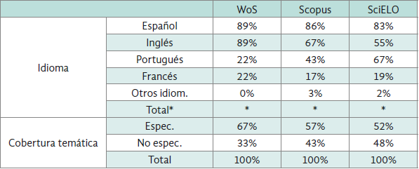 Al realizar un análisis considerando los idiomas aceptados por las revistas para la publicación de artículos, es notorio que WoS se particulariza por ser la base donde predomina más el idioma inglés. Entre WoS y Scopus se ubican en posiciones intermedias los idiomas español y francés. Por su parte, la base de SciELO es la que se particulariza por tener una mayor prevalencia del idioma portugués, que si bien está representado en las otras bases de datos (Scopus y WoS), no en el mismo nivel que en SciELO.
