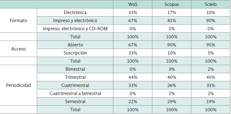 Al realizar el análisis considerando características tales como el tipo de formato y acceso, así como la periodicidad de las revistas, se aprecia que las revistas de WoS se particularizan por tener una mayor participación de las revistas en formato electrónico, acceso por suscripción y periodicidad trimestral y cuatrimestral. Por su parte, las bases de Scopus y SciELO se particularizan por tener una mayor participación de revistas en formato impreso y electrónico, ser de acceso abierto y periodicidad trimestral, cuatrimestral y semestral.