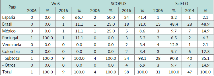 Un aspecto que conviene destacar es que en 2015 la participación de revistas de los países iberoamericanos se concentra en España y Brasil. En el WoS las revistas españolas concentran el 66.7% del total de revistas. En Scopus las revistas españolas y brasileñas representan en conjunto más del 70%. En la base de datos SciELO, la situación es claramente diferente, hay una baja participación de las revistas españolas (2.1%), pero en este caso la participación se concentra en tres países que representan el 76% del total de revistas, Brasil 48.9%, México 14.9% y Colombia 12.8%.