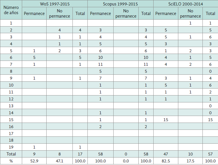 Es importante señalar que el total de revistas de investigación educativa de los países iberoamericanos identificadas en las tres bases de datos asciende a 94 en total; sin embargo, algunas de ellas no se han logrado mantener. El WoS presenta el patrón más excluyente pues de 17 revistas que lograron ingresar a la base de datos en el periodo 1997 a 2015, sólo 15 estuvieron de manera simultánea en los años 2010 y 2011, pero en 2015 ya sólo había 9 revistas. La participación de las revistas en Scopus es más estable, de 58 revistas iberoamericanas incluidas en esta base durante el periodo 1999-2015, todas se encuentran en la base de datos al final del periodo. No obstante, algunas de ellas salieron en el transcurso del periodo analizado, pero posteriormente volvieron a incluirse. Una salió por nueve años y otras tres lo hicieron sólo por el transcurso de un año. En este sentido, se puede señalar que la participación en Scopus tiende a ser más estable y mantener un patrón acumulativo de las revistas iberoamericanas que logran incorporarse a la base. No obstante, este no es el mismo caso en la base SciELO, pues en el periodo comprendido entre 2000-2014, se identificaron en total 57 revistas de investigación educativa, pero de ellas sólo 47 (82.5%) se mantuvieron hacia el final del periodo.