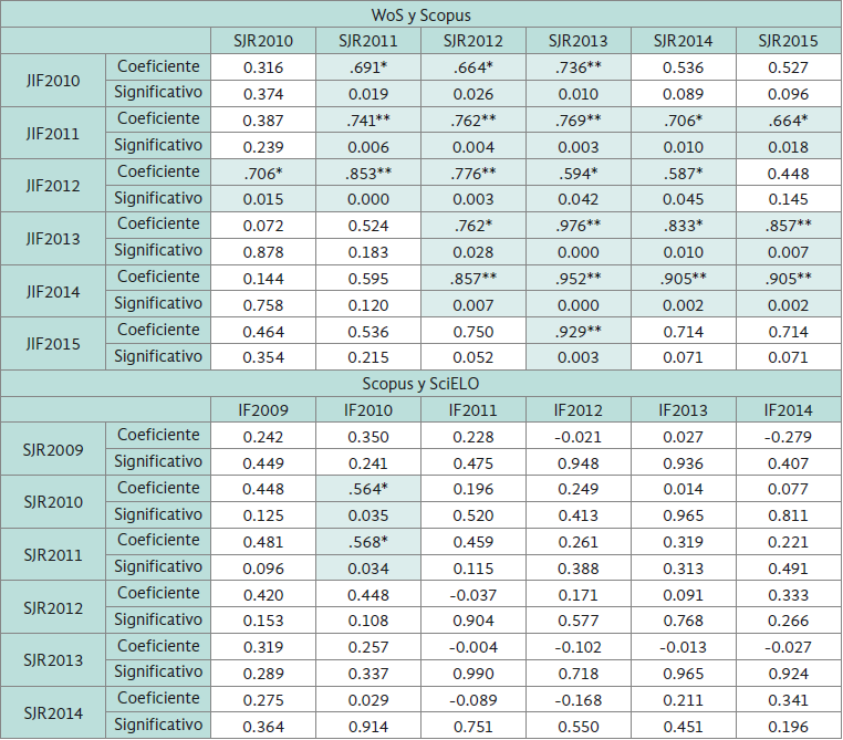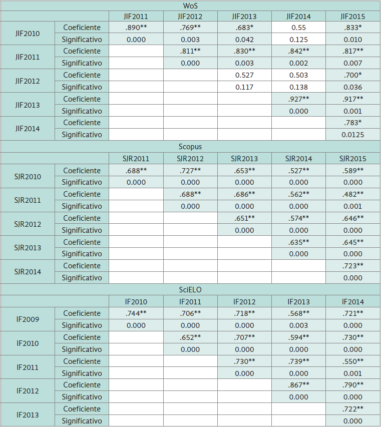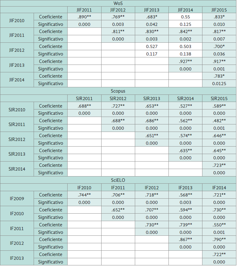 Al emplear la prueba Rho de Spearman para analizar la correlación que existía en los índices de impacto, resalta que al interior de cada base de datos hay una correlación positiva que se establece entre los índices a lo largo del tiempo. En la base de WoS, de las 15 pruebas aplicadas, 12 correlaciones (80%) resultan estadísticamente significativas y tienen coeficientes positivos de correlación que fluctúan entre 0.683 y 0.890, lo cual implica que son correlaciones altas. En el caso de Scopus, las 15 pruebas de correlación que se aplicaron resultaron positivas y estadísticamente significativas, con coeficientes que fluctuaron entre 0.527 y 0.727. Una tendencia semejante ocurre en el caso de SciELO, donde las 15 correlaciones que se aplicaron fueron positivas y significativas, con coeficientes de correlación que fluctúan entre 0.568 y 0.867.